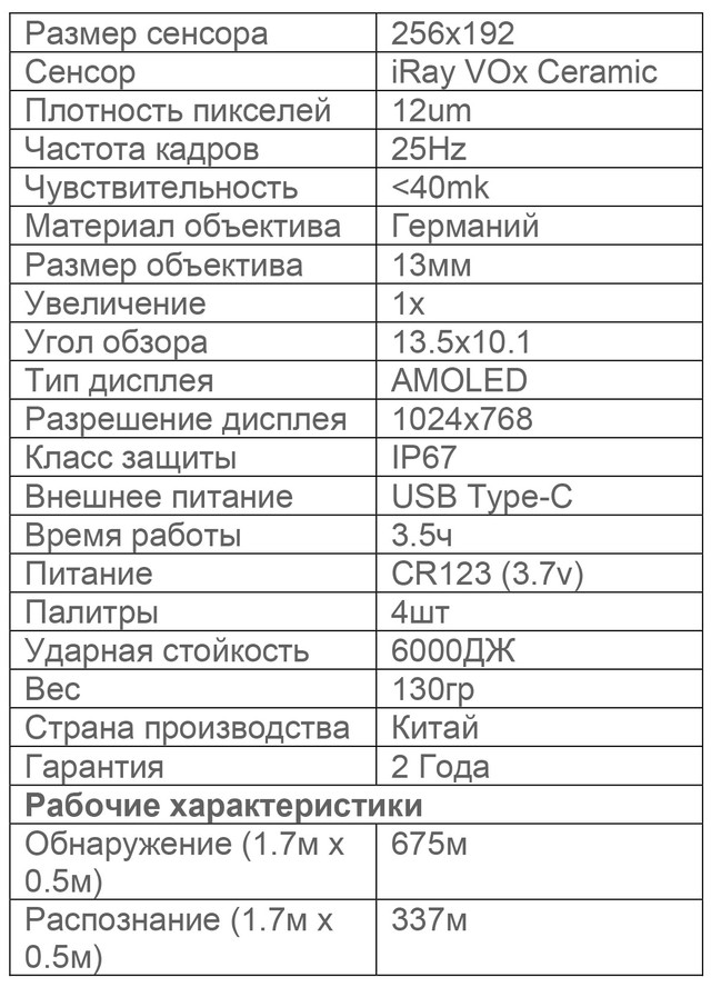 Оснащений матрицею iRay Vox 12um з роздільною здатністю 256х 192 пікселів, монокуляр неймовірно чутливий до підвищених температур, а значить легко зможе визначити місцезнаходження різних об'єктів. Теплові об'єкти розміром ростової фігури він виявить з відстані до 700 метрів. Яскравий OLED екран з роздільною здатністю 1024х 768 пікселів зробить зображення напрочуд реалістичним і деталізованим.